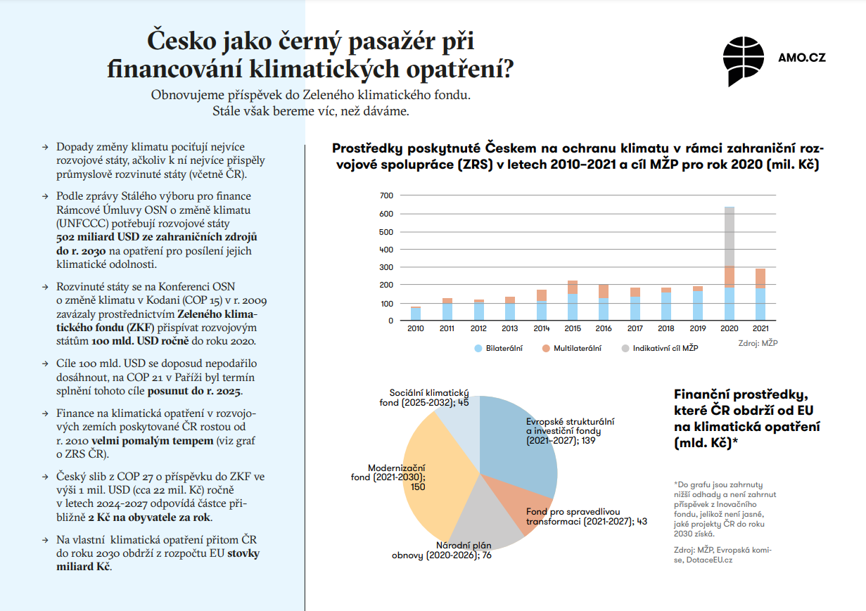 Česká republika se v přepočtu na obyvatele řadí mezi největší historické producenty emisí skleníkových plynů na světě. Z fondů Evropské unie finance na vlastní opatření spojená s dopady změny klimatu přijímá stamiliardy korun, zranitelným zemím však doposud přispívala jen velmi omezeně.
