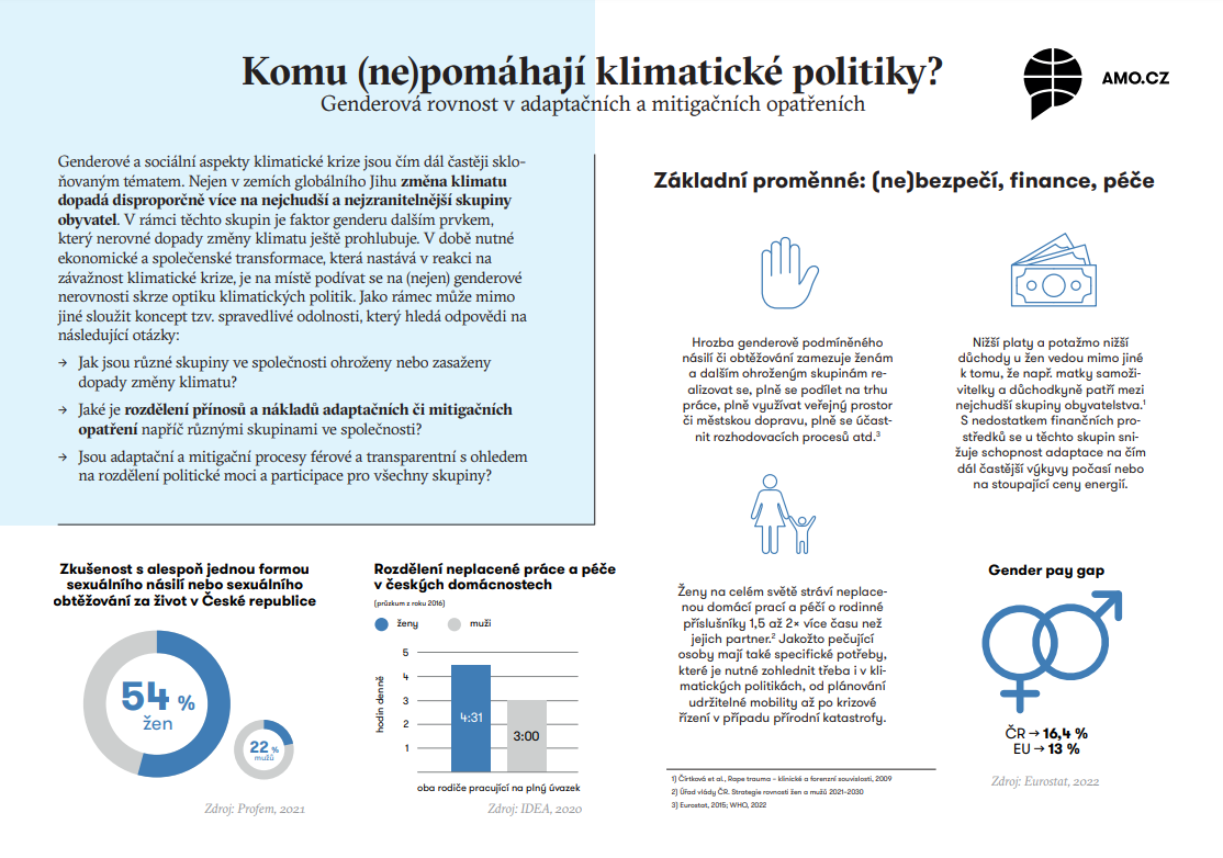 Factsheet přináší jak konkrétní příklady dopadů klimatických změn na ženy, tak příklady politik, které propojují udržitelnost s genderovou rovností.