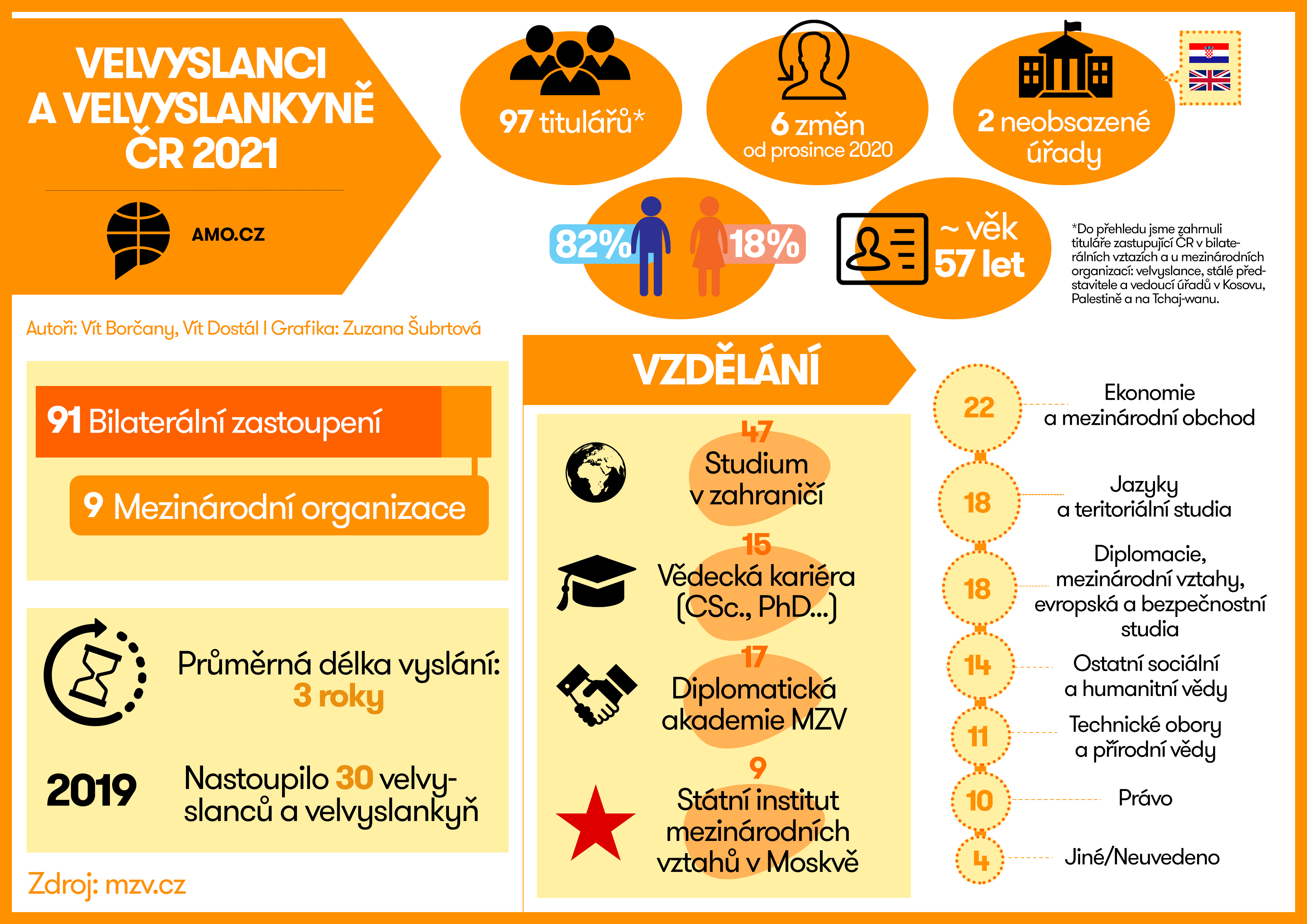 Z naší infografiky je patrné, že průměrný český zástupce v zahraničí je muž ve věku 57 let hovořící třemi světovými jazyky. Vystudoval mezinárodní obchod, jazyky, případně s diplomacií spřízněné obory. Velvyslanecký sbor je převážně profesionální, pouze dvanáct velvyslanců nemá zkušenosti s diplomatickou kariérou. Více informací naleznete v přiložené infografice.