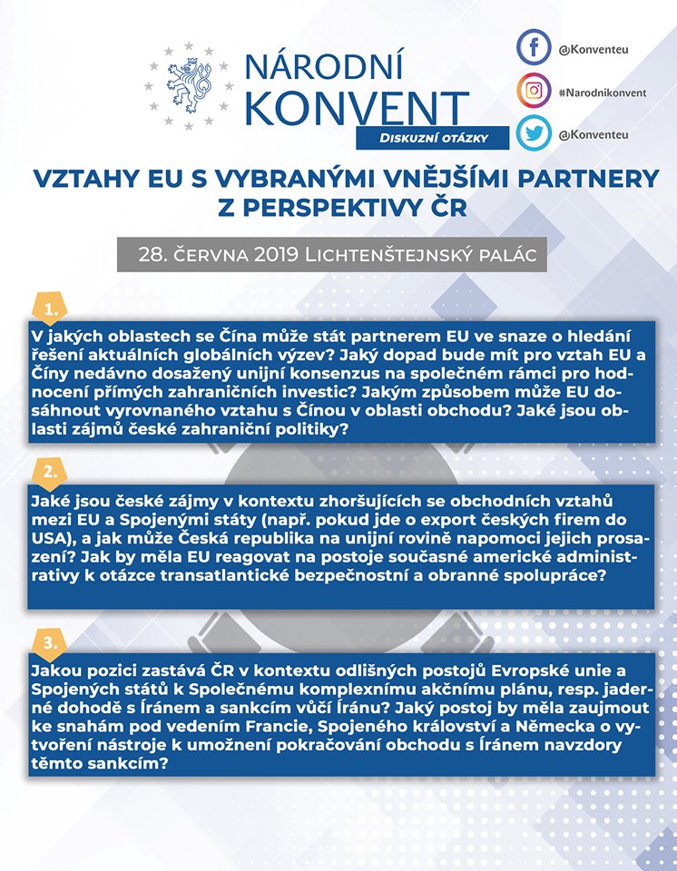 - V jakých oblastech se Čína může stát partnerem EU ve snaze o hledání řešení aktuálních globálních výzev? Jaký dopad bude mít pro vztah EU a Číny nedávno dosažený unijní konsenzus na společném rámci pro hodnocení přímých zahraničních investic? Jakým způsobem může Evropská unie dosáhnout vyrovnaného a recipročního vztahu s Čínou v oblasti obchodu? Jaké jsou v této oblasti zájmy české zahraniční politiky? 2. Jaké jsou české zájmy v kontextu zhoršujících se obchodních vztahů mezi Evropskou unií a Spojenými státy (např. pokud jde o export českých firem do USA) a jak může Česká republika na unijní rovině napomoci jejich prosazení? Jak by měla EU reagovat na postoje současné americké administrativy k otázce transatlantické bezpečnostní a obranné spolupráce? 3. Jakou pozici zastává Česká republika v kontextu odlišných postojů Evropské unie a Spojených států k JCPoA, resp. jaderné dohodě s Íránem, a sankcím vůči Íránu? Jaký postoj by měla zaujmout ke snahám pod vedením Francie, Spojeného království a Německa o vytvoření nástroje k umožnění pokračování obchodu s Íránem navzdory těmto sankcím?